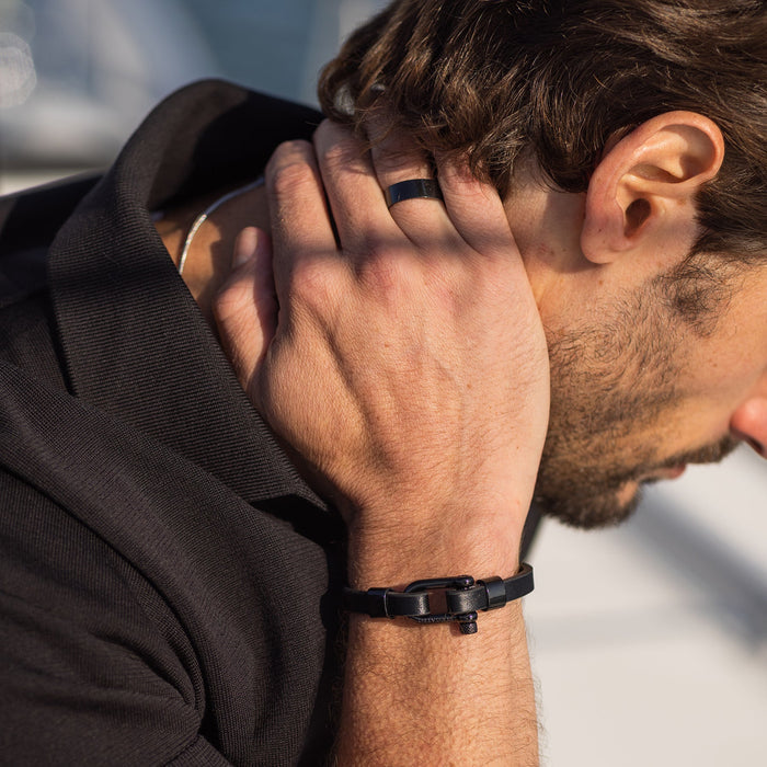Construída com couro 100% natural, com o clássico fecho de manilha de Aço inoxidável (316L). Aço de grau cirúrgico. Muito mais durável do que prata, ouro ou platina. Não vai enferrujar, corroer, manchar, desbotar ou tornar sua pele verde.